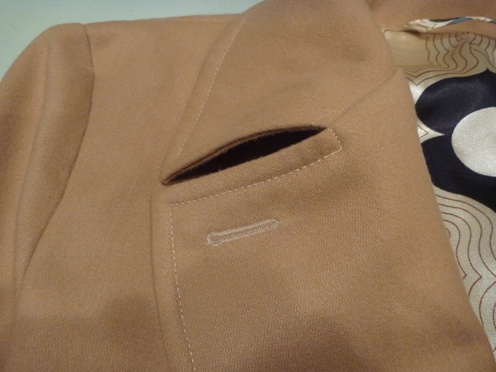The cuff is turned up and pressed. The hem on the sleeve is 1.5 inches. A 2.5 inch wide strip of bias cut haircanvas is placed in the hem so that 1 inch of canvas extends beyond the raw edge of the sleeve. I baste it temporarily in place. The edge of the sleeve is then stitched to the canvas with a 1/4" seam allowance. This is much easier to do on a free arm machine. On my 301 it's a PITA. The hem is turned up and the canvas is slip stitched to the sleeve. This produces a cuff with a little "oomph" to it. I think this is desirable on any outerwear.